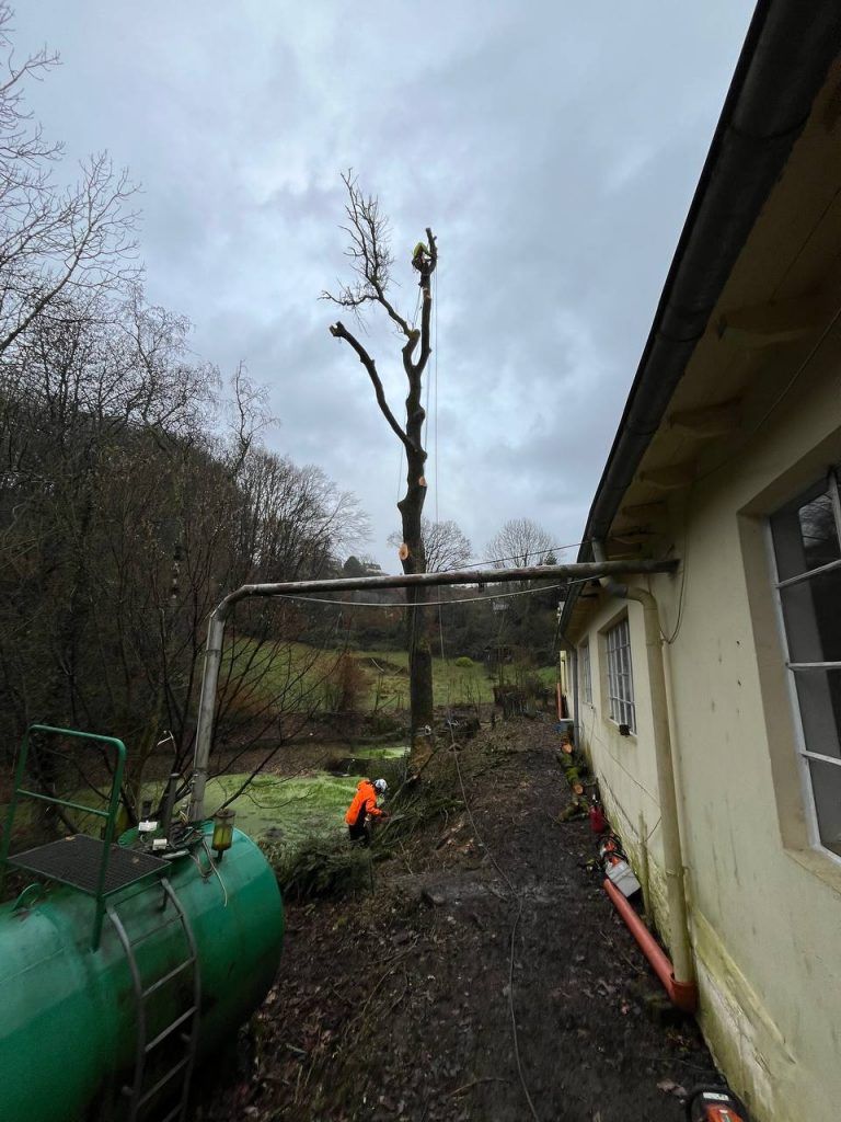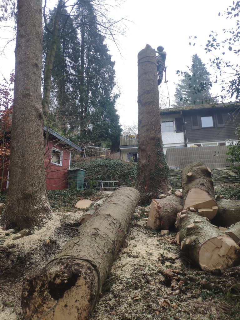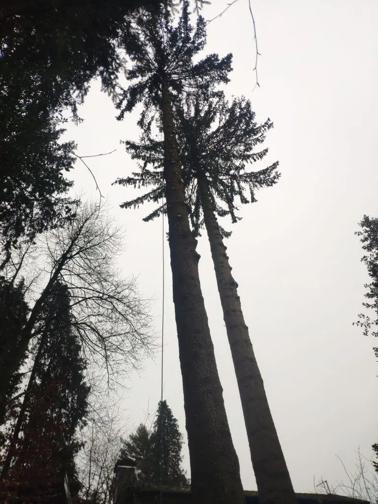 Zwei über 35 m hohe Fichten mussten in beengter Wohnlage sicher entfernt werden. Per Steigeisentechnik wurden alle Sektionen kontrolliert abgesetzt; die zweite Fichte fiel mit, um Windwurfrisiken zu reduzieren (fachgerechte Baumkontrolle).