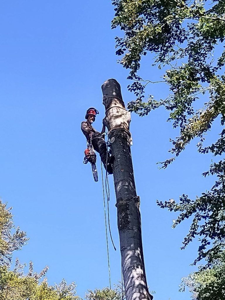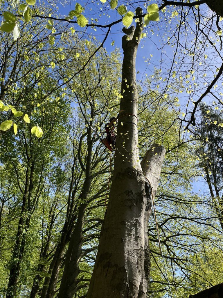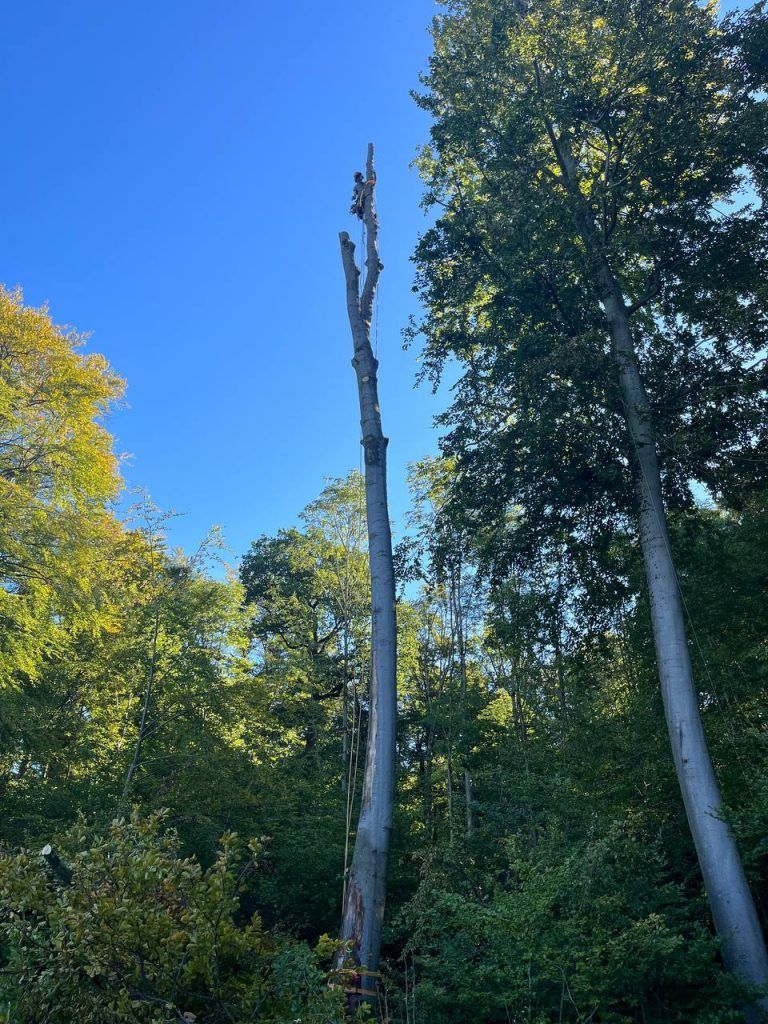 Eine altgewachsene Buche zeigte starke Schadbilder und gefährdete ein Wohnhaus. Wir haben die kritische Seite entlastet, den Stamm kontrolliert abgetragen und bewusst einen Habitatstamm belassen – Verkehrssicherheit und Artenschutz in Balance (nach vorheriger Baumkontrolle).